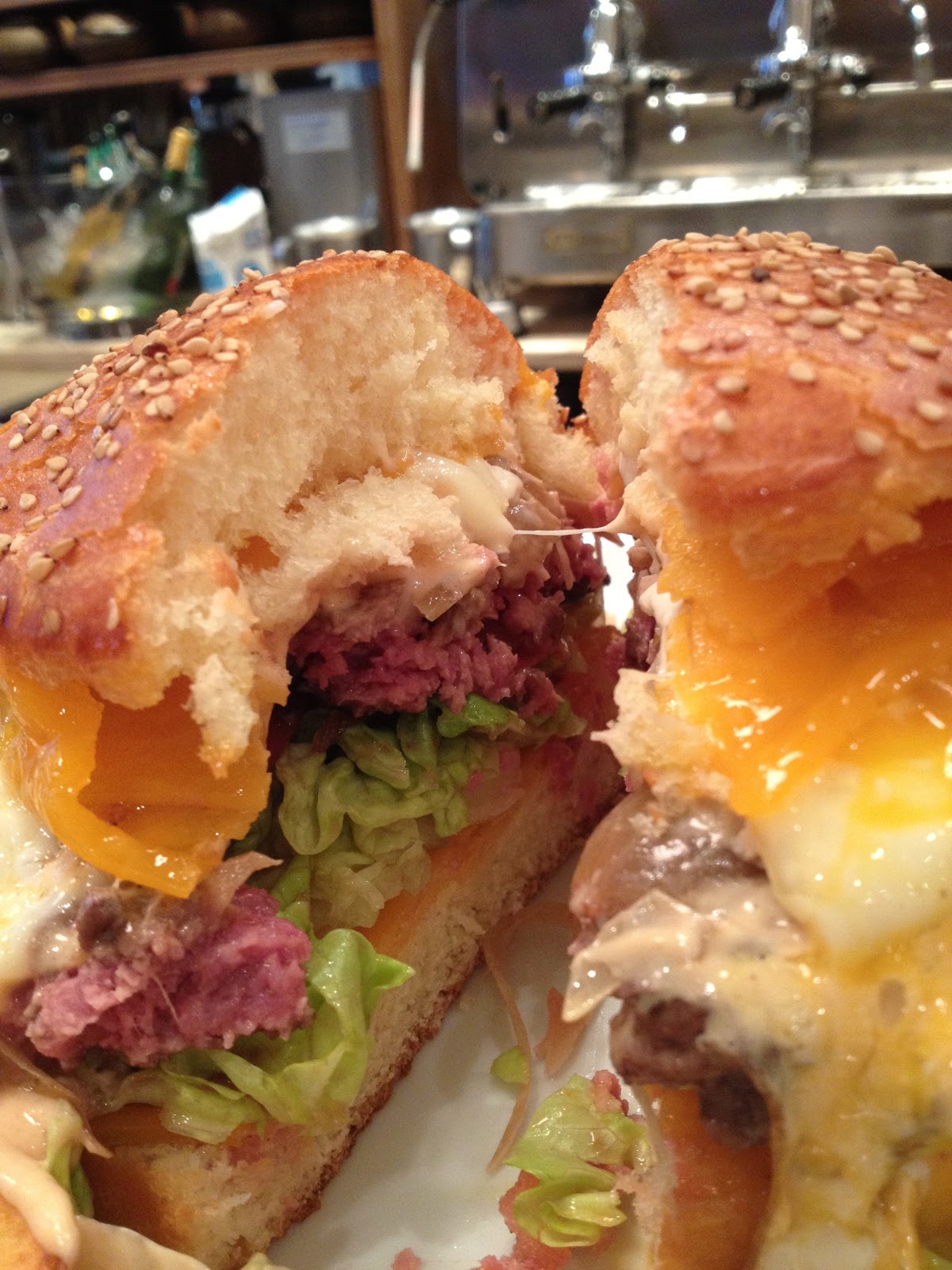 Looking around the room, I was far from the only person eating the burger. However I was the only person trying to do so with it in my hands. Queue several repeat requests for more napkins as, first the egg yolk, then the creamy mushroomy oniony imposter started to ooze all over my appendages.